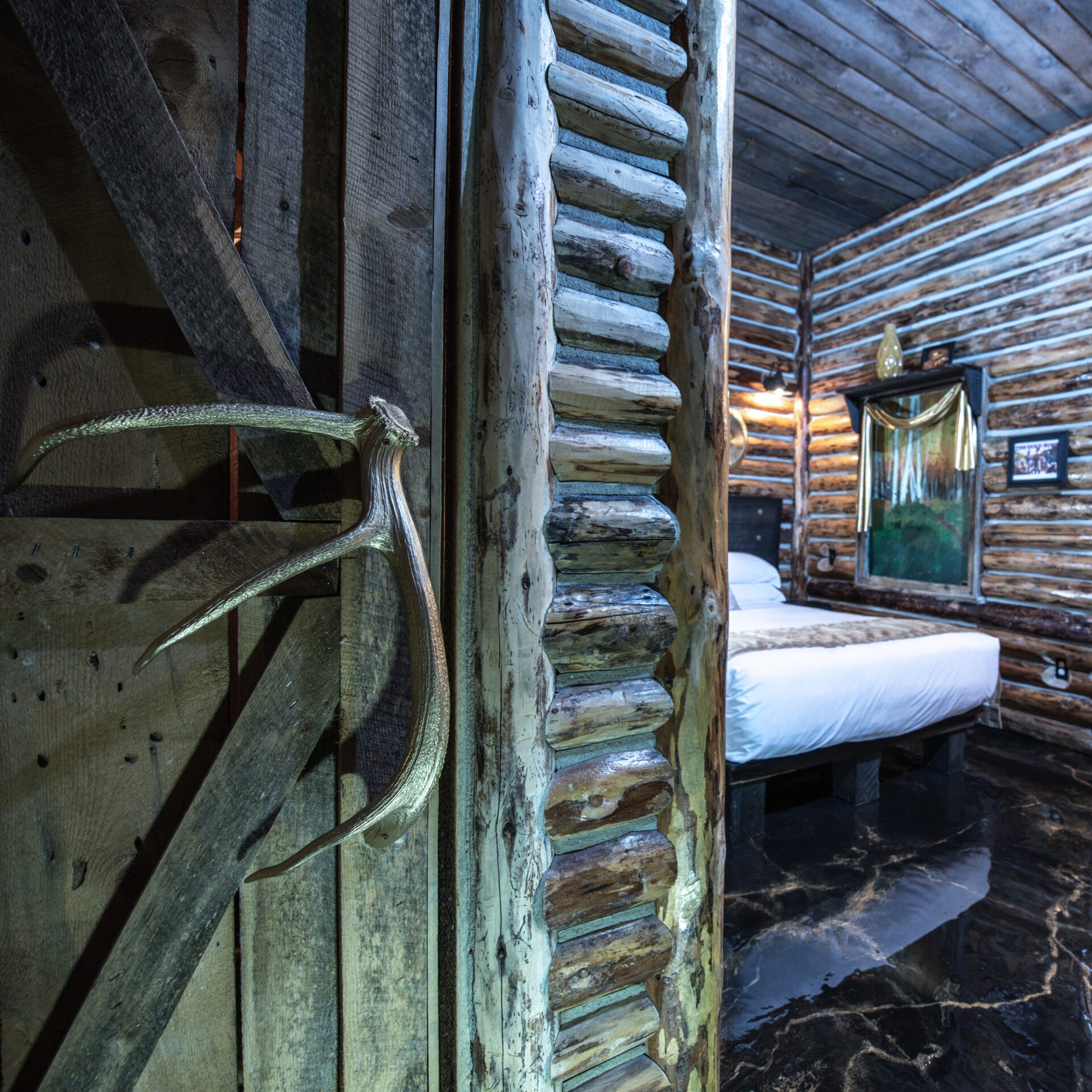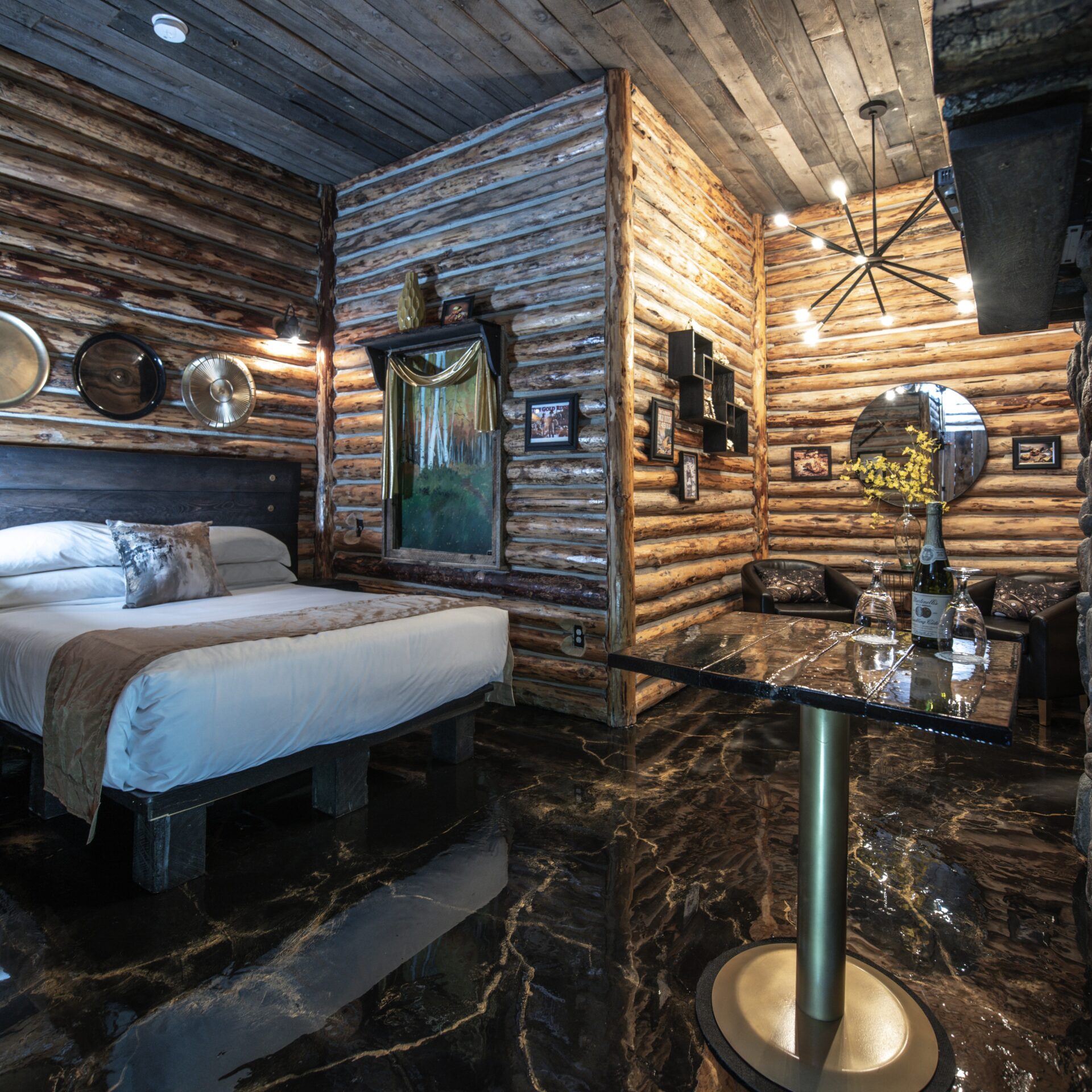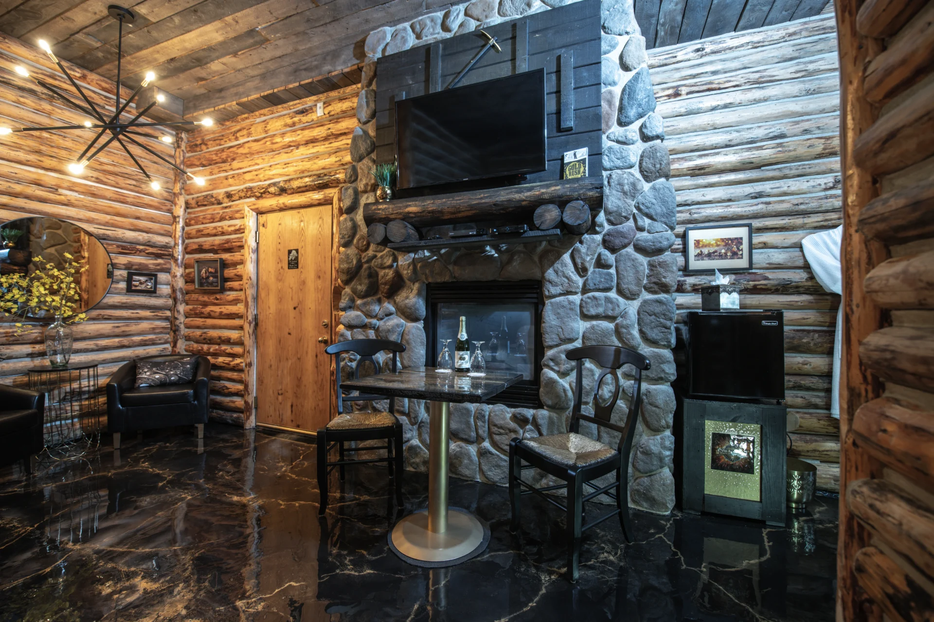 Step into the newly reimagined Gold Rush Suite, where rustic log walls and golden accents create the charm of a frontier cabin. Unwind by the stone fireplace, relax in the cozy log bed, and let the spirit of adventure surround you.
